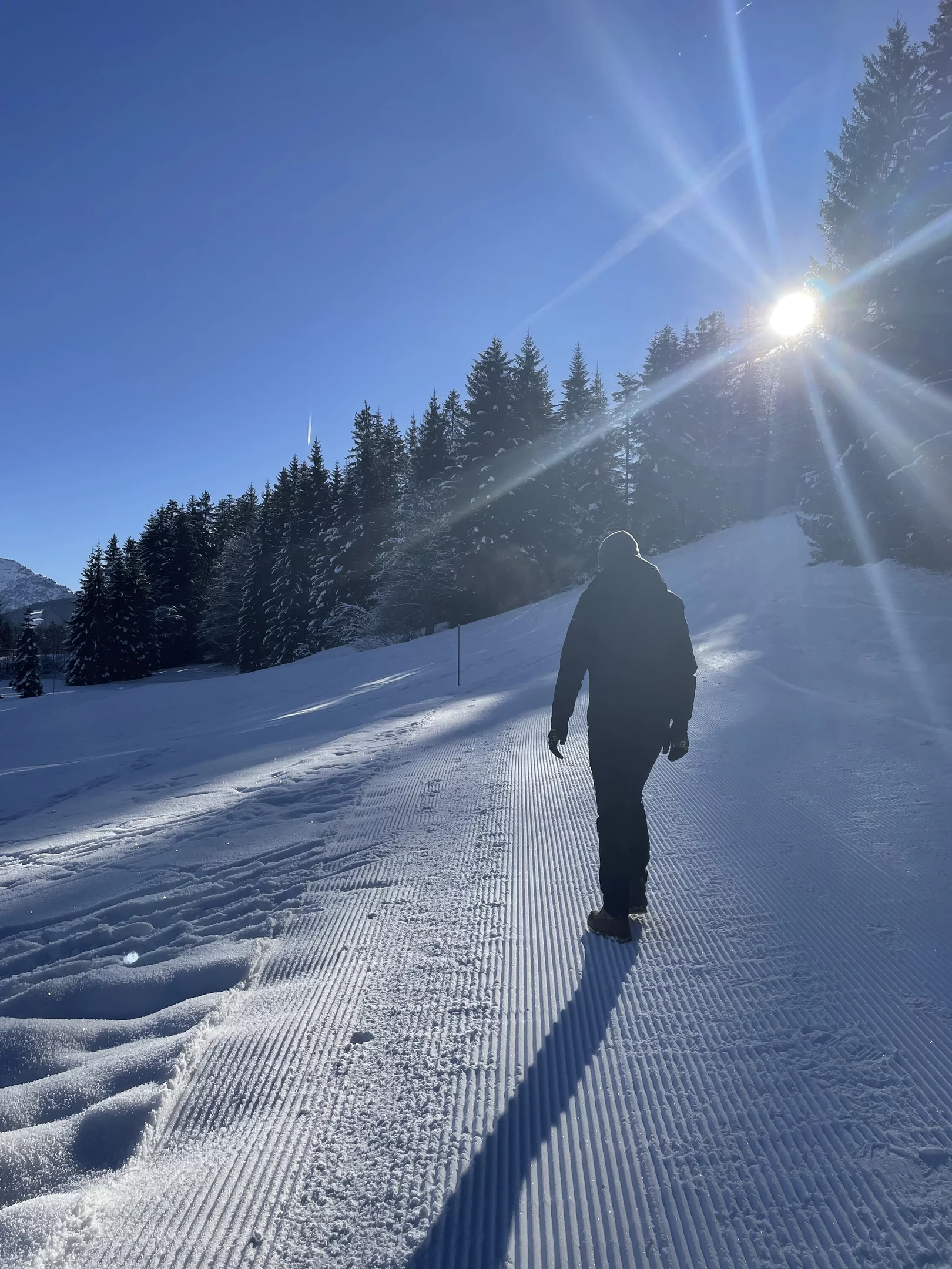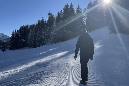 Direkt vor dem Hotel startet die Rodelbahn: gemütlich hoch wandern und dann runter rodeln zurück zum Grosslehen. Besonders romantisch wird es am Abend, dann ist die Rodelbahn bis Mitternachtet wunderschön beleuchtet.