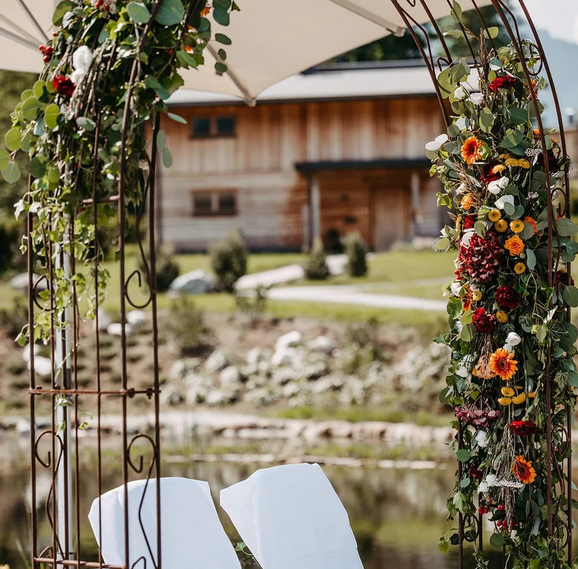 Unser Steg am Naturbadeteich ist der ideale Ort für eine romantische Zeremonie. Unberührte Natur inmitten der Kitzbüheler Alpen, hier lenkt nichts vom Allerwichtigsten ab: dem JA-Wort.
