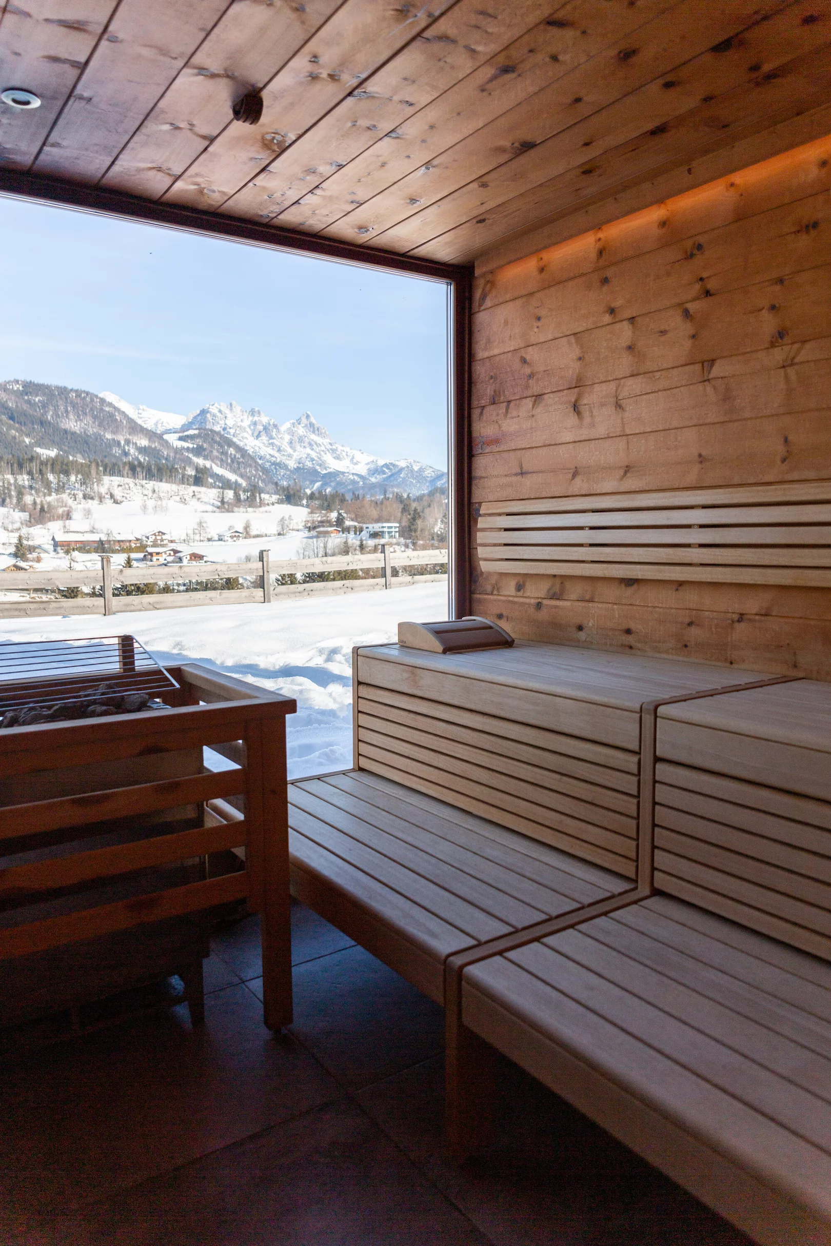 In Ihrem Chalet wartet Ihre private finnische Sauna – bereit, wann immer Sie es sind. Kein Zeitplan, keine anderen Gäste, nur Sie und die wohltuende Wärme. Genießen Sie entspannte Saunagänge mit Blick auf die Kitzbüheler Alpen, nutzen Sie eigene Aufguss-Essenzen oder einfach nur die heilsame Stille. Vom heißen Holz direkt auf die kühle Terrasse, dann zurück in die Wärme – Ihr eigener Wellness-Rhythmus. Besonders romantisch bei Sonnenuntergang oder unter dem Sternenhimmel.