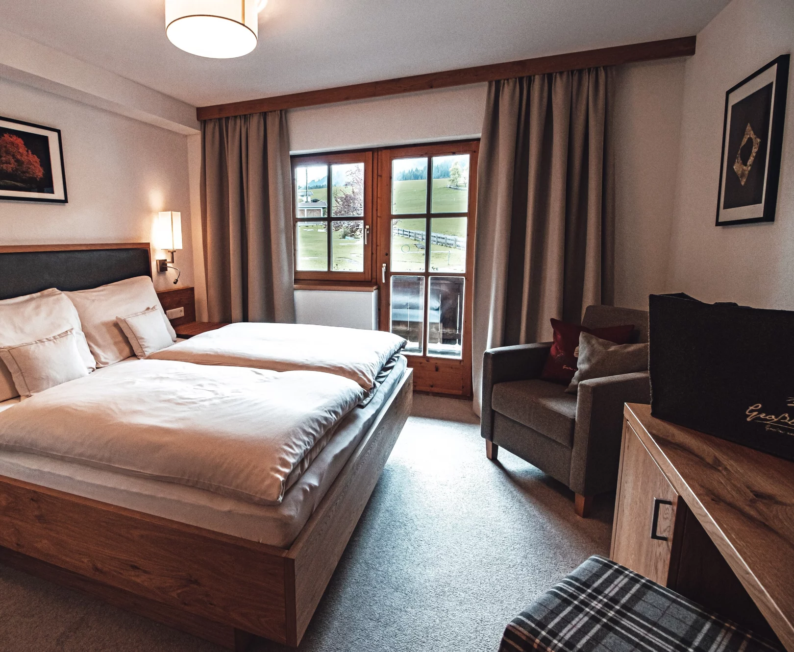 Das Naturzimmer Superior Gutshaus kombiniert Naturgefühl mit ausgesuchtem Luxus dies macht Ihren Lieblingsplatz auf Zeit zu einem Ort, den man am liebsten nie wieder verlassen möchte. Die neu renovierten Zimmer lassen auch in puncto modernste Technik keine Wünsche offen. Das i-Tüpfelchen: Sobald die ersten Sonnenstrahlen durch Ihr Fenster blinzeln, werden Sie von einem herrlichen Blick auf das Kitzbüheler Horn überrascht.